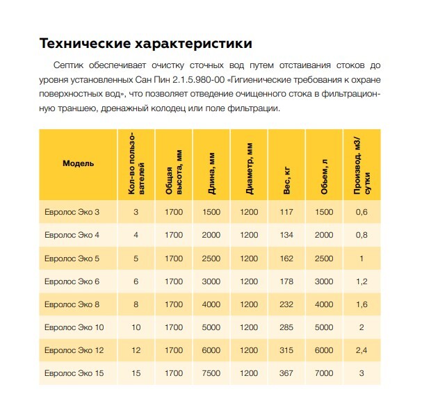 Септик изготовлен на основании технических условий ТУ 4859-001-51954959- 2013 из монолитного полипропилена и предназначен для биологической очистки хозяйственно-бытовых сточных вод (ХБСВ), поступающих от отдельного дома или коттеджа, в условиях отсутствия централизованной системы канализации. Выбор модели Септика зависит от количества пользователей и суточного объема сточных вод